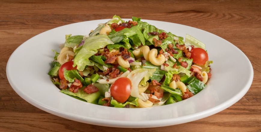 Crisp romaine tossed with grilled chicken, ditalini pasta, bacon, tomatoes, green onion and bleu cheese crumbles served with your choice of dressing.