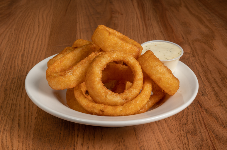 Onion rings, mozzarella stix, mac & cheese balls, and pizza logs served with a side of sauce and ranch.
