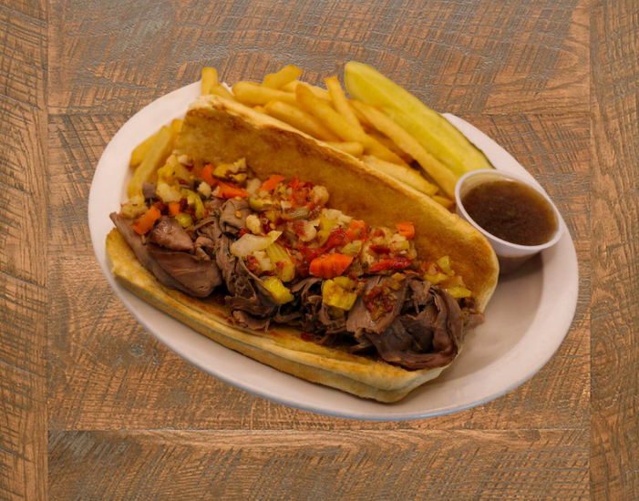 Slow roasted, thinly sliced beef dipped in an Italian herb au jus, topped with spicy giardiniera relish on a baked hoagie roll. Served with french fries.