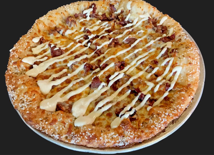 Olive oil, garlic with a kimmelweck crust top with fresh sliced roast beef, mozzarella cheese and horseradish sauce